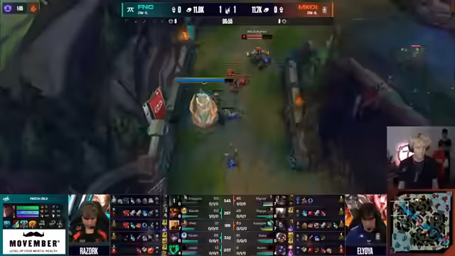 10:30:36Die Bewertung des Matchups zwischen Wladimir und Akali dominiert die Analyse. Jojos aggressiver Spielstil wird als entscheidender Vorteil identifiziert, während Wladimir auf Level 6 achten muss, um nicht ins Hintertreffen zu geraten. Die Experten bewerten Drafts, wobei Cassiopeia als sicherer Option gegenüber Azir gilt. Ein erstes Teamfight mit einer schöneren Kombination von Fnatic führt zu First Blood und einem Goldvorteil.