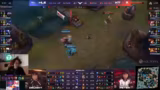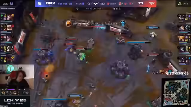 03:01:22Nach dem erfolgreichen Dragon-Fight steht es 1-0 für DRX. T1 versucht, den Druck durch ein frühes Top-Lane-Swap auszuüben, um Guma zu einem Level-6-Vorteil zu verhelfen. Allerdings spielt DRX diese Situation richtig, fälschlicherweise einen Angriff vor und erzwingt einen Fight, in dem sie den ersten Kill holen. Dieses Missed Play und das verspätete Teleport von Doran führen zu einem klaren Goldvorteil für DRX und lähmen die T1-Strategie.