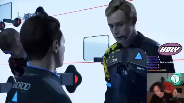 07:41:15Die Handlung wendet sich einem größeren Konflikt zu: dem Aufstand der Androiden. Detroit wird von einer gestörten Androidenpopulation verwüstet, es kommt zu Plünderungen und gewaltsamen Auseinandersetzungen mit der Polizei. Augenzeugen berichten von Angriffen, während der Streamer den Verlauf der Ereignisse und die zukünftige Auswirkung auf die Welt analysiert. Die Situation eskaliert rapide und deutet auf einen bevorstehenden Bürgerkrieg hin, der die Beziehungen zwischen Menschen und Androiden zutiefst erschüttert.