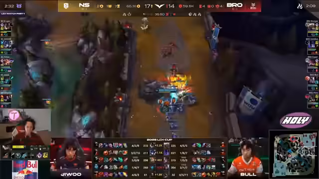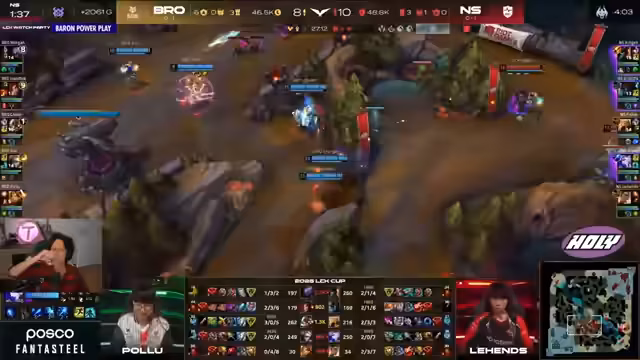 03:01:04Die Teams kämpfen intensiv um Baron Nashor. Ein riskantes Unterfangen von Klauser, der tief im gegnerischen Gebiet agiert, wird durch den Einsatz seiner Ultimativen Fähigkeit und die Notwendigkeit, sich sofort mit Zhonyas Stundenglas zu schützen, unterstrichen. Trotz des Fehlens eines Smites seitens des gegnerischen Junglers Closer, der normalerweise für das Stehlen des Barons zuständig wäre, gelingt es Nongshim, Nashor für sich zu beanspruchen. Closer, der im Spiel 7/0 steht, zeigt eine beeindruckende Leistung. Klausers hohes Gold-Bounty macht ihn zu einem primären Ziel. Ein riskantes Manöver von Humbug im gegnerischen Busch wird als sowohl genial als auch riskant bewertet. Der Kampf um den Baron Nashor ist extrem eng, wobei das Spiel weiterhin spielbar bleibt, solange Closer sein Zhonyas nutzen kann. Kingen erweist sich jedoch als eine Bedrohung. Die Bedeutung von Team Bro im Kontext des LCK-Cups wird hervorgehoben, da ein Sieg für sie auch ein Sieg für Gruppe Baron gegen Gruppe Elder wäre.