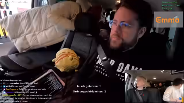 03:50:24Im Chat wird der Begriff 'Walz' im Zusammenhang mit Handwerkern erwähnt, was den Streamer und die Mitfahrer neugierig macht. Sie diskutieren darüber, dass es sich um Wandergesellen handeln könnte, die auf ihrer Wanderschaft durch Deutschland sind und sich selbst kein Geld ausgeben dürfen. Dies wird als interessante Form der Ausbildung gesehen, die der Streamer und seine Mitfahrer bisher nicht kannten.