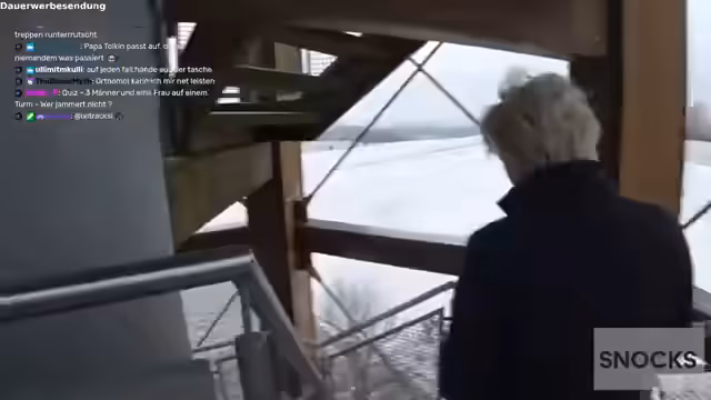 04:36:33Beim Ankommen am Saale-Turm in Thüringen schlägt der Streamer vor, einen Wettbewerb zu veranstalten: wer als Erster die 192 Stufen des Turmes hochläuft, muss den anderen zwei Teilnehmern je 50 Subs spendieren. Die Idee ist, die Besteigung zu einem unterhaltsamen Wettrennen zu machen und dabei gleichzeitig die Anhänger zu motivieren, da die Verlierer der Streamer die Community unterstützen würden.
