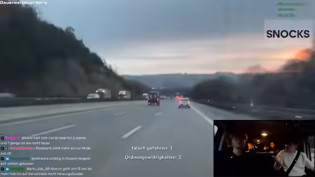 00:27:43Während der Fahrt nach München beschäftigen die Streamer technische Probleme, wie eine unsichtbare Chat-Funktion und ein unterbrochener Internetzugang. Gleichzeitig führen sie Alltagsgespräche, etwa über teure Restaurants, Lebensrealitäten im Bergbau oder die Vor- und Nachteile von Winter- und Allwetterreifen. Die Stimmung ist geprägt von entspannter Unterhaltung und spontanen, oft humorvollen Anekdoten, die den Roadtrip-Charakter des Streams unterstreichen.