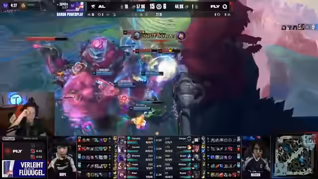 13:54:41FlyQuest kämpft zwar verbissen, hat aber ein massives Schadensdefizit. Insbesondere Aurora durch Rohrbild wird als nutzlos kritisiert, da der Champion zu wenig Einfluss hat. Die Teamfights sind von Fehlern auf beiden Seiten geprägt, aber Anyone's Legend nutzt seine Superstar-Spieler wie Tarzan und Shanks effektiv aus. FlyQuest kann trotz Mountain-Soul als Win Condition das Spiel nicht drehen, da sie in den kritischen Momenten nicht genügend Damage erzeugen.