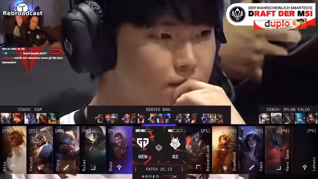 00:13:12Der Cast beginnt mit der Darstellung des großen Duells und der damit verbundenen Storylines. Der amtierende Weltmeister Gen.G, der mit einer beeindruckenden 19-0-Bilanz in das Match geht, steht im Fokus. Die Kommentatoren äußern große Bewunderung für die statistische Dominanz des koreanischen Teams, erwähnen aber auch die große Hoffnung, dass G2 den amtierenden Meister endlich besiegen kann. Die Spannung liegt auf der Kopf-an-Kopf-Duelle in der Mid-Lane zwischen Caps von G2 und Chovy von Gen.G, sowie auf der Rivalität zwischen Faker und Ruler, die jedoch im Hintergrund steht.