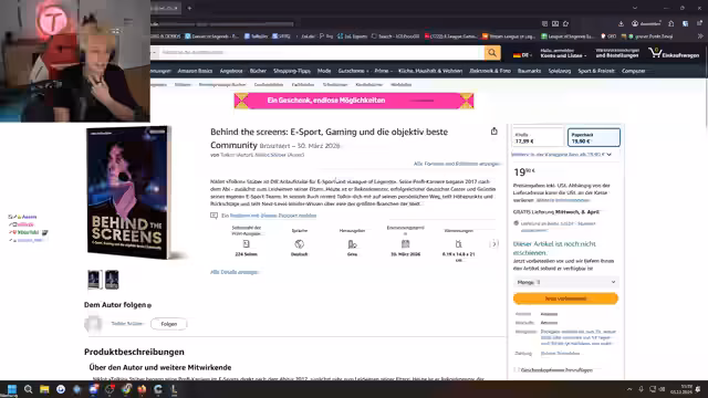 02:24:21Der Streamer reflektiert seine Challenger-Vergangenheit in League of Legends und erklärt, dass er in den letzten zehn Jahren immer Challenger war, aber dieses Jahr bewusst weniger Tryhard betreibt. Er betont, dass dies eine wichtige menschliche Entscheidung war, um mit dem Lebensabschnitt nach zehn Jahren Challenger-Dasein abzuschließen. Stolz verkündet er, dass er ein Buch fertiggestellt hat, das am 30. März 2026 erscheinen wird. Er ist offiziell Autor und hat sich damit einen Kindheitstraum erfüllt. Das Buch, das anderthalb Jahre in Anspruch nahm, ist eine Autobiografie mit Behind-the-Scenes-Einblicken in den E-Sport. Er bittet um Vorbestellungen auf Amazon und Thalia, um die Chancen auf einen Platz auf der Spiegel-Bestsellerliste zu erhöhen. Aktuell rangiert das Buch bereits in verschiedenen Amazon-Kategorien, was auf erste Vorbestellungen hindeutet. Er erwähnt, dass das Buch 52.552 Wörter umfasst, wobei das Wort "Faker" 78 Mal vorkommt, und dass es ein Kapitel über Faker und seine Bedeutung für den E-Sport gibt.
