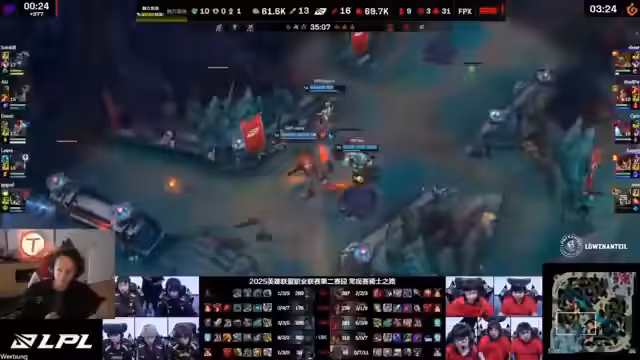 00:05:45Die Aufmerksamkeit richtet sich auf das fünfte und entscheidende Spiel der LCK-Serie zwischen FunPlus Phoenix und Nongshim RedForce im Play-In. Tolkin drückt seine Unterstützung für FPX aus, besonders wegen des Spielers Shadow. Er kommentiert die Spielzüge und die Leistung der Teams, wobei er die schwierige Situation von NRP beschreibt und die unfairen Bedingungen nach einer Barriere am Nexus kritisiert.
