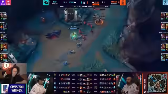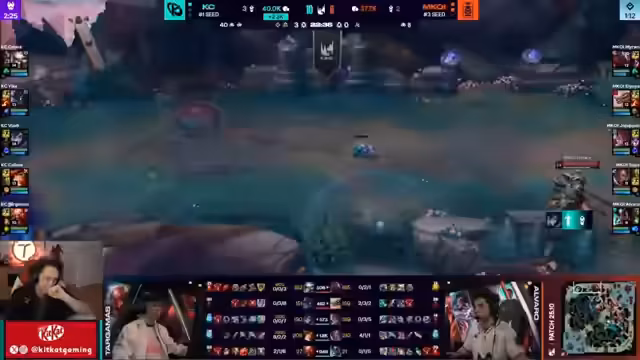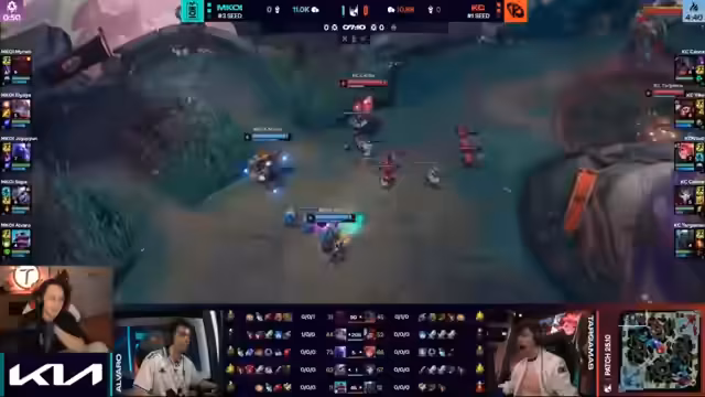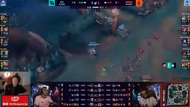 05:10:43Karmikor zeigt starke Koordination, um den zweiten Drake zurückzuerobern. Maukai nutzt seine Ultimate, um die gegnerischen Ranken zu blockieren, und ein gut platziertes Todesurteil führt zu einem 'Double Kill' und der erfolgreichen Draken-Controle. Gleichzeitig werden kritische Fehler von Koi thematisiert, so stirbt beispielsweise Jodephan ohne Flash, was einen klaren Verlust an Gold und Momentum darstellt und das Spiel stärker zugunsten von KC kippt.