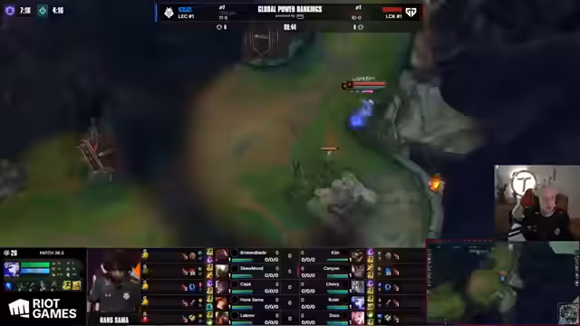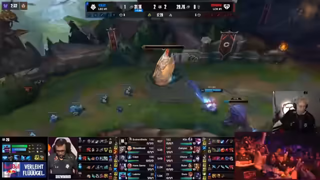 05:10:56Im Mid-Game eskaliert das Spiel. G2 nutzt seine starke Positionierung, um objektive Kontrolle zu erlangen. Ein entscheidender Gang auf die Mitte führt zum ersten Blut für Caps, der Chovy tötet. G2 gewinnt daraufhin den wichtigen Krabbenkämpf und nutzt den Vorteil, um Drakes zu kontrollieren. Analysten preisen die Aggressivität von G2, insbesondere von Caps und Hans Sama, die den Druck auf Gen.G aufrechterhalten und es ihnen unmöglich machen, strategisch vorzugehen.