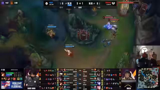 04:13:26G2s Mid-Game-Struktur basiert auf der starken Dominanz von Caps auf der Mid-Lane, was direkte Einflüsse auf Bot und Jungle hat. Ein koordinierter Dive-Bot-Lane-Play mit Cassian wird eingeleitet, um den AD Carry Ruler zu isolieren. Obwohl das Dive-Play trotz zwei Kills nicht in einen Drake-Konvert mündet, gilt es als strategisch wichtig, da es Gen.G. Zeit und Ressourcen kostet. Der aggressive Druck der G2-Spieler, insbesondere von Hans und Labrov, wird als entscheidend für die map-weite Dominanz angesehen.