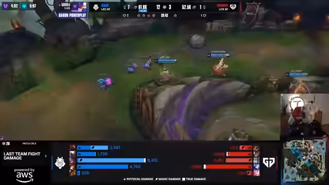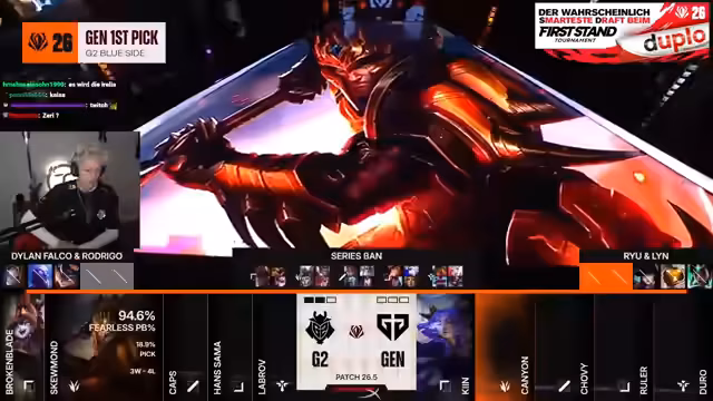 03:26:05G2 entscheidet sich für Pantheon anstelle von Viktor in der Mid-Lane, da dieser gegen Ashe besser schärft, besser parieren und andere Taktiken ermöglichen kann. Skrimont führt eine aggressive Taktik durch: opfert den Gromp im Jungle, um zu ganken, und nutzt seine Ultimate auf der Bot-Lane für einen Kill, von dem Labrov ebenfalls profitiert. Dies führt zu einem Break-Timer gegen den bisher ungeschlagenen Gegner Gen.G, was als exzellente Early-Game-Führung gelobt wird.