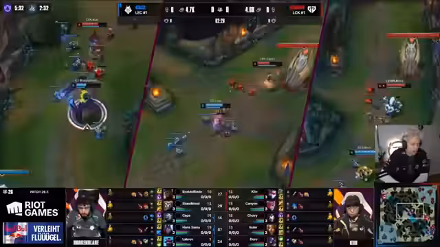 03:27:39G2s Bot-Lane, insbesondere Caps als Ashe, agiert extrem dominant. Durch kluges Positionieren und den Flash von Seraphine werden mehrmals gegnerische Spieler in der Bot-Lane getötet. Die erste Eliminierung erfolgt durch Labrovs Ulti, gefolgt von einer zweiten, bei der drei gegnerische Spieler sterben. Diese schnellen und effizienten Kills sichern G2 einen signifikanten Goldvorteil und eine starke Ausgangsposition im Spiel.