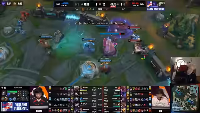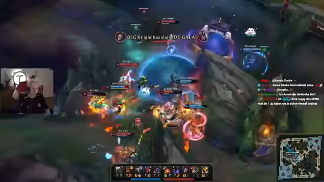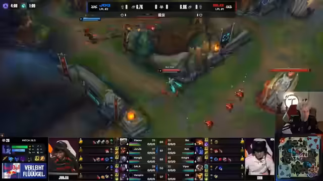 07:54:10Das Spiel endet mit einem deutlichen 3-0-Sieg für Bilibili Gaming. Viper zeichnet sich durch mehrere präzise Ashe-Pfeile aus, die entscheidende Kills für BLG ermöglichen. JDG scheint Probleme mit der Map-Kontrolle zu haben und verliert wichtige Teamkämpfe. Kommentare wie 'Stomp' und '3-0-Winkel' unterstreichen die Dominanz von BLG. Der Kommentar hebt hervor, dass JDG, trotz eines starken Start in der Split, das Spiel am Ende klar verloren hat.
