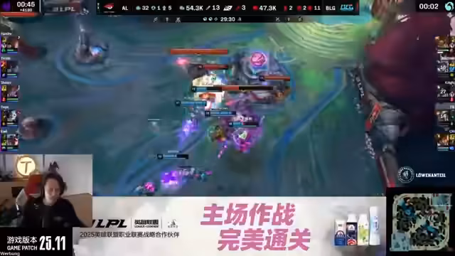 00:44:33Das Spiel schreitet voran und der Streamer kommentiert die laufende Aktion. Er bemängelt die beiden erfolglosen Top-Ganks von BLG als kritischen Fehler, der Anyones Legend Vorteile, insbesondere am Drachen und durch den erfolgreichen Atakan-Spawn, verschafft. Im Teamfight lobt er die starken Fähigkeiten von Anyones Legend, insbesondere von Knight, der mehrere Flashes erzwingt. Gleichzeitig kritisiert er die unkoordinierte und schwache Performance von BLG, insbesondere den fehlenden Impact des AD-Carries.