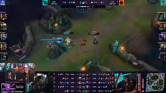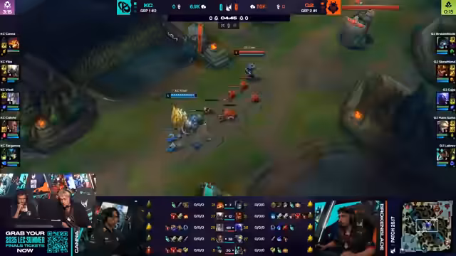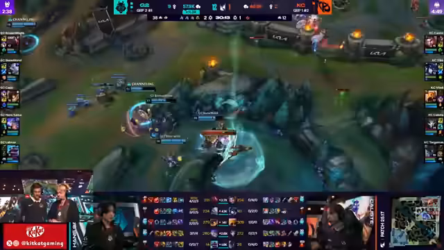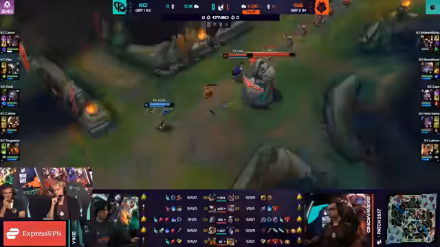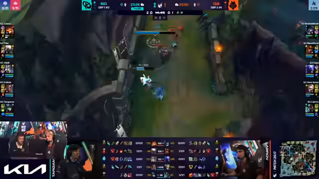 02:15:08G2 startet Harald, Viktor ist bereit zum Teleportieren. Aurora flankiert, was zu einem großen Teamkampf führt. G2 opfert zwei für eins, was akzeptabel ist. Es wird betont, wie abhängig die Carries davon sind, Flash bereit zu haben. G2 nimmt einen dummen Kampf an, ohne die besten Voraussetzungen zu schaffen. K-Corp erzwingt einen Kampf, aber Akali wird von Sissau gekontert, was zu einem Double-Kill für beide Carries führt. G2 opfert den Drachen, um den Harald zu gewinnen. G2 sichert sich den Atakan, was ihnen zusätzliche Skalierung verleiht. Kaliste hat einen CS-Vorsprung gegenüber Sivir. Zeri wird mit drei Gegenständen gefährlich, besonders da niemand Rüstung gekauft hat. Der Ausgang hängt davon ab, ob Akali und Aurora einen guten Flank finden können.