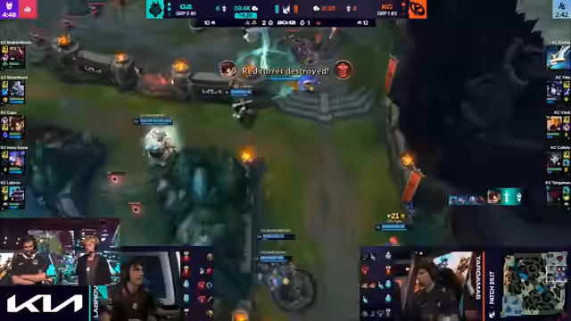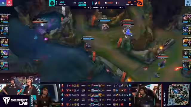 01:34:33K-Corp sichert sich den Nashor und schaltet die Bot-Inhibitoren aus, was zu Super-Minion-Druck führt. Caps versucht zu zaubern, wird aber von Corki fast oneshotted. Broken Blade stirbt trotz Flash, und K-Corp pusht weiter. G2 versucht, einen Drake zu stehlen, aber K-Corp kontert und sichert sich den Drake. Kalista richtet enormen Schaden an, und K-Corp kann das Spiel beenden. G2 verteidigt sich zwar noch kurz, aber K-Corp ist in Überzahl und zerstört den Nexus. Der Draft von G2 wird als schlecht bezeichnet, und K-Corp wird für ihr solides Spiel gelobt. Die Draft von G2 war riskant und erforderte, dass sie besser als ihre Gegner sind, was jedoch nicht der Fall war.