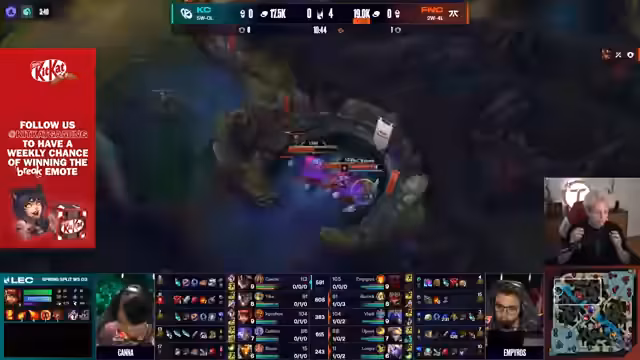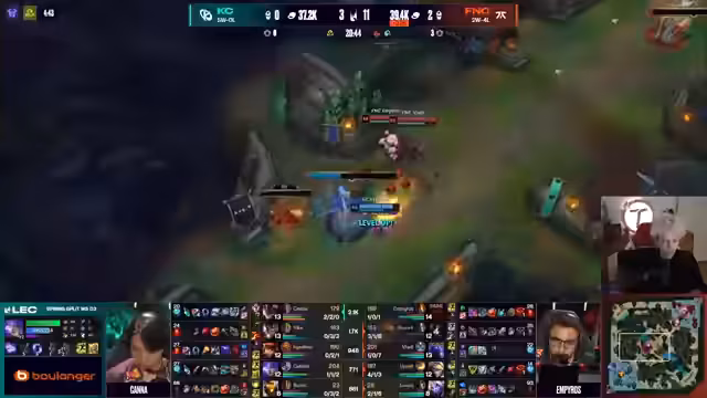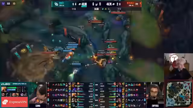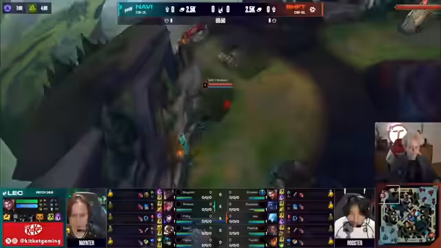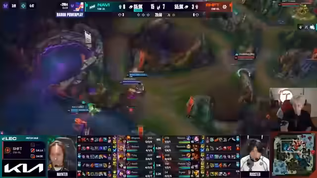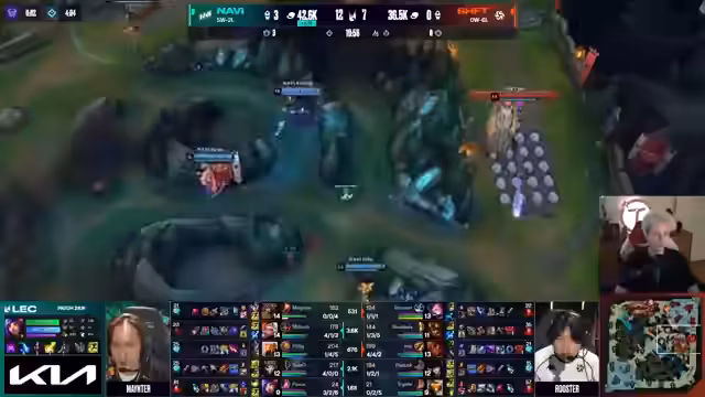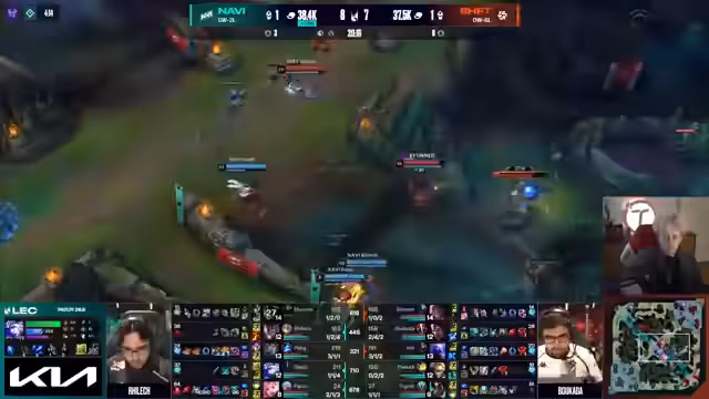02:14:20Navi spielt langsam unnötig, sollte um Nashor spielen. Die Fans und Chat sind über KCOP-Fans geteilter Meinung. Nuklear zeigt starkes Late-Game mit Edge of Night und Serpent's Fang. Ein bemerkenswerter Play mit Pobi's Pentakill auf großer Bühne. Navi gewinnt dominant mit 6-2, während Fnatic gegen KCOP steht.