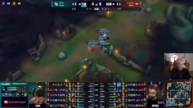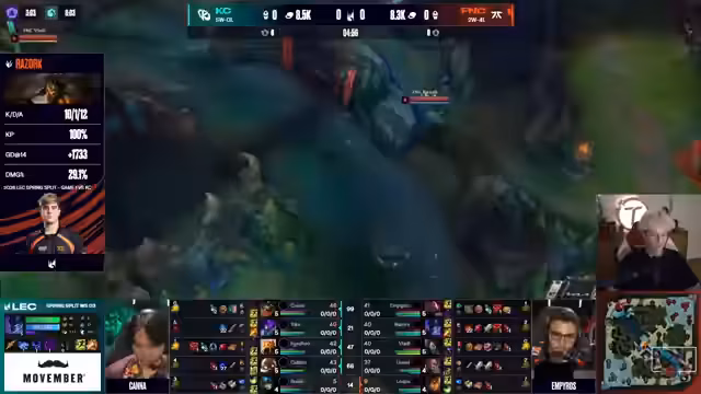 03:17:54Fnatic setzt ihre Dominanz im Mid Game fort und zeigt eine beeindruckende Leistung, besonders von Razork mit einer 17:1 KDA. Das Team zeigt besseres Teamfighting als früher und nutzt gut die Itemvorteile. K-Corp wirkt überfordert und macht Fehler in den Entscheidungen. Fnatics Draft, der auf Late-Game ausgelegt ist, beginnt zu zahlen. Die französische Crowd zeigt Unmut während Fnatics Powerplay sich verstärkt.
