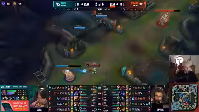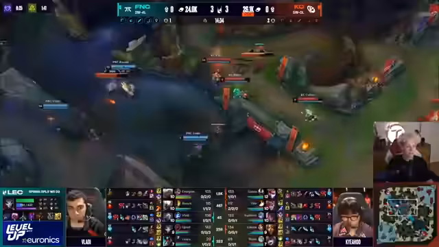 03:10:56Fnatic zeigt eine starke frühe Spielphase gegen K-Corp. Vladi und Razork führen das Team zu einem beeindruckenden Early Game Sieg mit First Blood für Vladi. Razork zeigt besondere Fähigkeiten mit 4 Kill-Beteiligungen und Vladi entscheidet wichtige Fightes. Fnatic, normalerweise für schwache Early Games bekannt, dominiert diesmal das frühe Spiel und baut einen Goldvorsprung auf. Das Gameplay zeigt taktische Tiefe mit gut timeten Ultis und strategischen Positionierungen.
