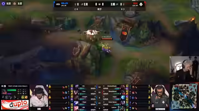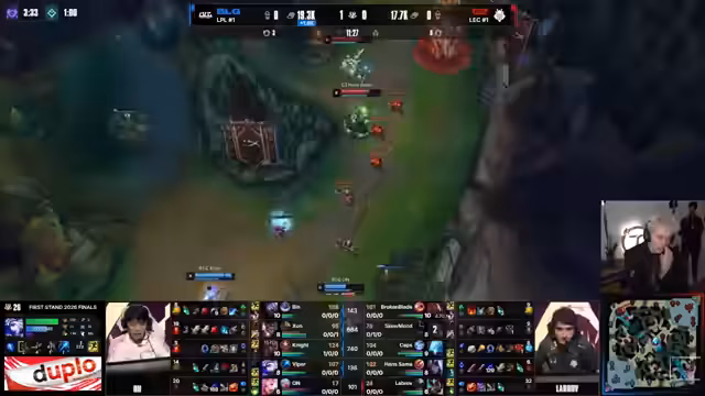 04:16:41Nach dem frühen Verlust der Kontrolle konzentriert sich G2 auf das Sammeln von Objekten, insbesondere dem Drachen, um ins Spiel zu kommen. Der Fokus liegt darauf, einen entscheidenden Nashor-Zug zu riskieren, wenn BLGs Team weniger aufmerksam ist. Versuche, den jungler On zu isolieren und zu eliminieren, scheitern jedoch, was BLGs strategische Überlegenheit unterstreicht und G2 weiter unter Druck setzt.