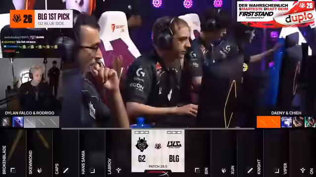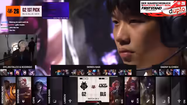 01:51:47Die Draft-Phase entscheidet über das Match-up. BLG startet mit Lulu, um die Hyper-Carry-Botlane zu schützen. G2 reagiert mit der Ban-Strategie gegen Yunara, um den AD-Carry zu schwächen und eine Kill-Lane mit Jarvan IV und Nami zu erzwingen. Die Wahl von Poppy als Blinde-Pick für Skirmion bei G2 wird als Schlüssel gegen BLGs Spielstil gesehen. Analysten bewerten die Drafts als sehr aggressiv und strategisch klug von beiden Seiten.
