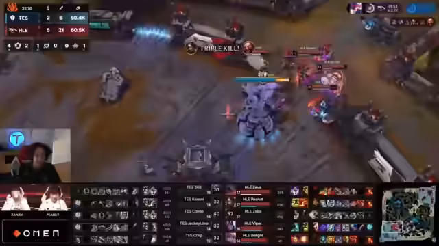 11:38:26Top Esports gerät in eine schwierige Lage, nachdem sie alle drei Lanes verloren haben und Schwierigkeiten haben, einen günstigen Engage zu finden. Hanwha Life nutzt ihre Kartenkontrolle und den Goldvorteil, um ein Teamfight am Drachen zu erzwingen. Eine kritische Entscheidung von Hanwha Life führt zu einem Fehlschlag, während Kanavi erneut einen genialen Play macht, indem er den feindlichen Azir liest und tötet. Dies ermöglicht den Chinesen einen erfolgreichen Ace und sichert ihnen einen massiven Vorteil, der das Game praktically zu ihren Gunsten entscheidet.
