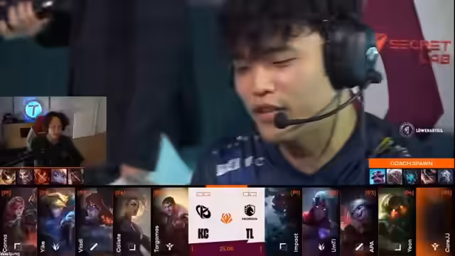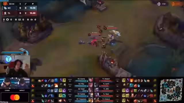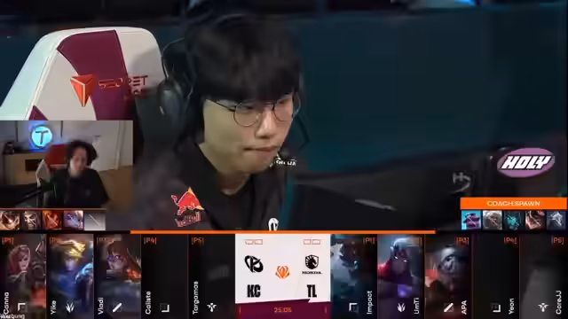09:18:24Das zweite Spiel beginnt mit einer hektischen Laning-Phase. Kana als Camille hat es schwer gegen Impact, der Dorans Shield wählt, was kritisiert wird. Botlane wird sofort durch einen aggressiven Play von Liquid unter Druck gesetzt, bei dem sogar der Nachwuchsspieler Yike von Kalista getötet wird. Die erste Bloodflow geht an Liquid, was den Spielbeginn dominieren lässt.