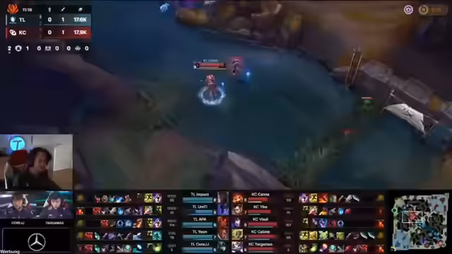 01:39:17Für das zweite Spiel wählt K-Corp mit Azir und Vladi einen starken Mid-Laner und Top-Laner. Der Kommentator lobt diese Draft als deutlich besser und sieht gute Match-ups, insbesondere für Kanas Camille gegen Impact. In der frühen Lane-Phase zeigt Kana starkes Playmaking, indem er Impact unter Druck setzt und ihm den Farm verwehrt. Gleichzeitig wird ein Fehler von K-Corps Mid-Laner, APA, analysiert, der durch arrogantes Verhalten und falschen Wave-Management seinen First Blood an Vladi verspielt.