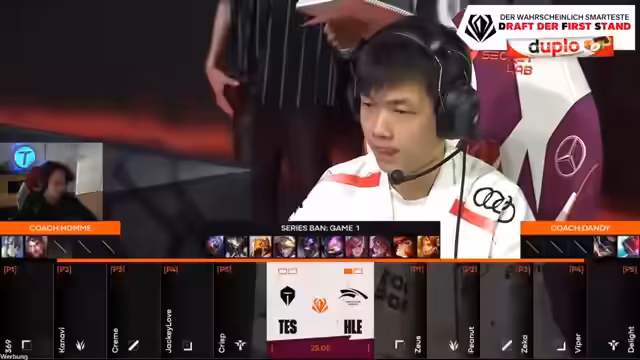 11:09:13Der Stream beginnt mit der Analyse des Draft-Prozesses für das erste Spiel. Es wird betont, dass die Draft-Phase entscheidend ist, um Vorteile zu sichern, besonders in Best-of-Serien. Der Fokus liegt auf dem Champion-Pool, wobei Champions wie Olaf und spätere Tanks wie Sejuani oder Zac erwartet werden. Der Analyst hebt hervor, dass Skarner, trotz mehrfacher Nerfs, vom Jungler Peanut gepickt wird, und analysiert die Stärken und Schwächen des Champions. Er erwartet, dass Europa gegen China und Korea weiterhin eine hohe Meta-Priorität auf den Champions wie Azir und Yone hat.