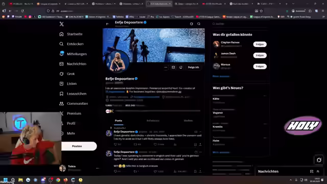 02:41:00Der Streamer äußert seinen Wunsch, Echo häufiger zu sehen, idealerweise auf der Toplane oder Midlane, aber am wahrscheinlichsten im Jungle. Er bemerkt jedoch eine Verschiebung in seiner Präferenz hin zu Weiger, der von einem Buff profitiert hat und dessen Counterpicks generft wurden. Er diskutiert die geringe Wahrscheinlichkeit von Toplane-Carrys und prognostiziert stattdessen Laneswap-Bruiser wie Besser oder Jacks. Der Streamer betont, dass sein Wunsch nach Echo-Toplane unrealistisch ist. Es folgt eine kurze Unterbrechung durch Barry. Der Streamer kommentiert die Spielsituation, in der Schombank mit einem Ulke auf Kalista agiert und Jax den Top-Turm einreißt. Zivo sorgt für Verwirrung mit einer überraschenden Aktion. Der Streamer scherzt über einen möglichen OnlyFans-Account und Meme-Inhalte. Er spricht über die Möglichkeit, aus einem schlechten Witz Kapital zu schlagen, und erwähnt seine behaarten Hobbit-Füße als potenzielles Verkaufsargument.