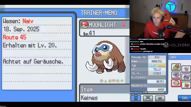 07:24:33Nachdem die Herzschuppe gefunden wurde, kann Quiekel Antikkraft lernen. Es wird überlegt, ob Schlammbombe dafür weichen muss. Der Streamer fragt sich, in welcher Stadt es einen Supermarkt gibt und sucht nach einem Magmarisierer für Magma. Nach dem Kauf des Magmarisierers werden die Items im Inventar durchgegangen, um die bestmögliche Ausrüstung für die Pokémon zu finden. Es wird überlegt, welche Items an Palkia und Magma gegeben werden sollen. Der Streamer kauft Eisheiler und überlegt, ob er Blizzard für Traxi kaufen soll, entscheidet sich aber dagegen. Nach dem Verlassen der Stadt werden die toten Trainer in der Pokémon-Liga besucht, um Items zu looten, aber diese haben keine. Magma erhält den Magmarisierer, aber entwickelt sich nicht sofort. Der Streamer stellt fest, dass die automatische Entwicklung nicht aktiviert war und korrigiert dies. Es werden Items an die Pokémon verteilt, wobei Rosenrauch an Lina und Kingstein an Magma gegeben werden. Alle Pokémon werden auf Level 42 gebracht, dem Level Cap, und das Team ist bereit für die Pokémon-Liga. Es wird überlegt, ob Blizzard für Quiekel gekauft werden soll, aber er ist hauptsächlich ein Nahkampf-Champion. Die Reihenfolge der Wichtigkeit der Pokémon im Team wird festgelegt: Felker, Traxi, Lina, Zowie, Moonlight und Uli.