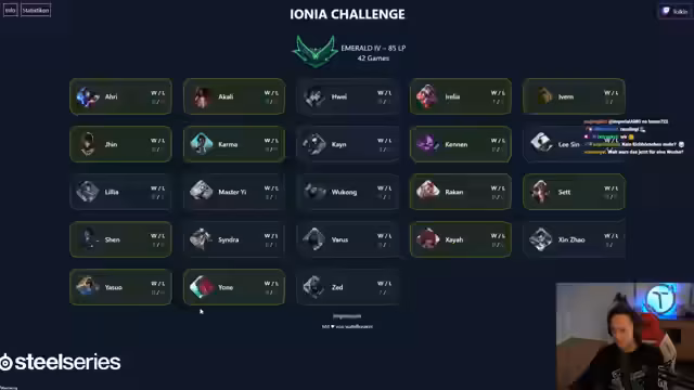 03:24:19Nach dem LCK-Spiel wechselt der Streamer zu einem anderen Spiel, der 'Master of Ionia Challenge' im Ranked-Modus. Er hat bereits mehrere Champions erfolgreich durchgespielt und ist jetzt in der Top-Lane. Er flext Picks wie Irelia und Shen und versucht, seine verbleibenden Champions so lange wie möglich zu halten. Der Streamer unterhält sich mit dem Chat über den Erfolg seiner Kleidung (schwarze T-Shirts haben eine hohe Winrate) und plant, einen weiteren Champion zu picken.