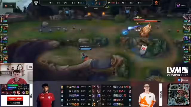 00:37:44Das erste Spiel zwischen G2 Nord und TOG beginnt mit einem Gewinn von G2 Nord auf der Bot-Lane, das得益于 Bart-Engage. Obwohl TOG überraschend Level 3 erreicht hat, konnten G2 Nord den ersten Kill holen. Nach anfänglichem Gleichstand gewann G2 Nord das erste Drachen-Duell, was den Snowball in Gang setzte. Durch brillante Execution, insbesondere durch Scattershot und Bard-Portale, dominierten sie den Mittelspiel. Sie erzwangen Kills, sicherten sich Objektive und bauten einen uneinholbaren Goldvorsprung auf, was zum klaren Sieg führte.