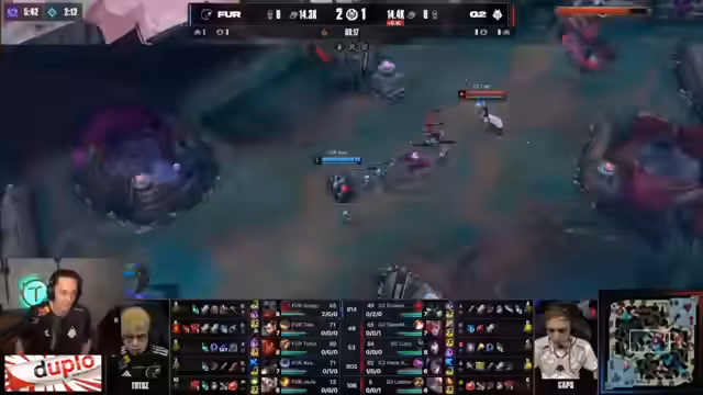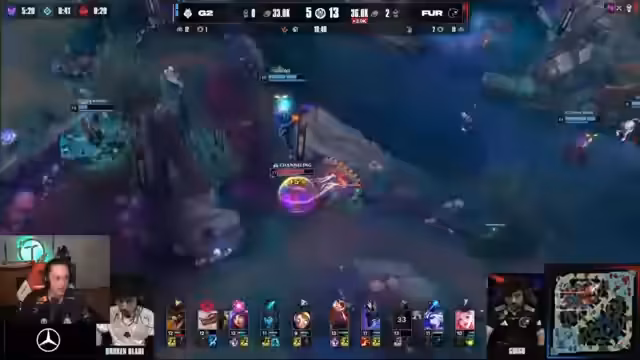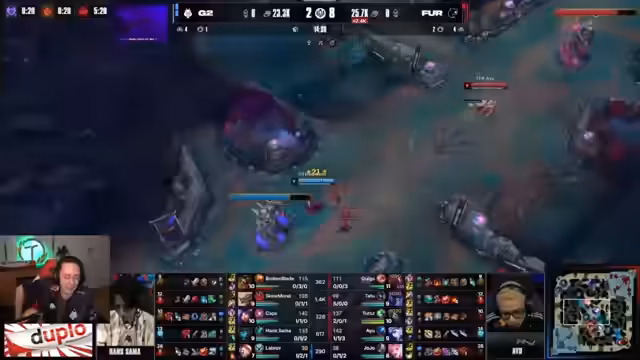 04:15:51Der Verlauf der Partie wird durch eine Reihe von kritischen Teamfunden entschieden. Furia beginnt zu dominieren, als Arthox von Bot-Lane nach Mitte wechselt und dort Druck auf Caps ausübt. Ein Teamfight um den Herald endet zu Gunsten von Furia, die den Heralds mit Hilfe eines gut platzierten CC-Chains von Rakan sicherstellt. G2s Versuch, durch eine Poppy-Ultimative und einen Vi-Gank einen Gegenangriff zu starten, misslingt komplett. Broken Blade, der weit ins gegnerische Terrain vorgestoßen war, wird isoliert und eliminiert. Die Brasilianer nutzen den Fehler und besetzen das Schlachtfeld erfolgreich, sichern sich nicht nur den Herald, sondern auch weitere Turmschäden und erweitern ihren Goldvorteil erheblich.