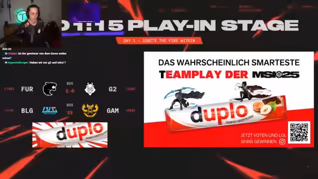 06:40:06Ein Partner des Turniers, Duplo, hat eine sehr große Praline und Goodiebox geschickt, die im Stream gezeigt werden. Der Kommentator nutzt dies, um ein Gewinnspiel auf Instagram anzukündigen. Die Zuschauer können kommentieren, welcher Champion am häufigsten gespielt wird, und haben die Chance, Hextech-Chests und den Luna-Ash-Skin zu gewinnen. Duplo ist bereits seit mehreren Jahren Partner des MSI, was mit einer positiven Botschaft gewürdigt wird.