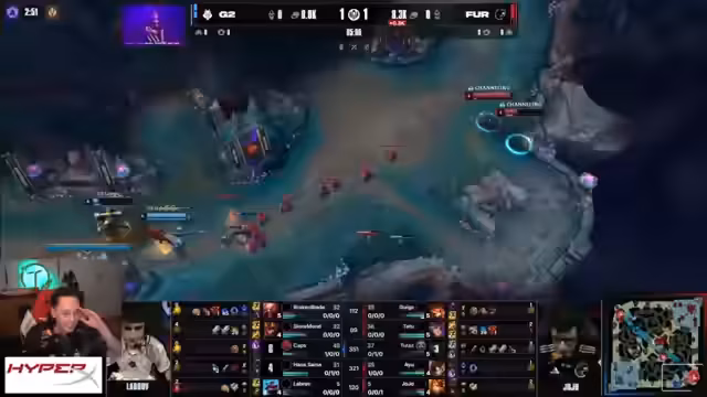 08:04:57Der Fokus liegt auf der anhaltenden Performance von G2 Furia im Entscheidungsspiel. Gruhigo wird als objektiv stärkerer Toplaner angesehen, während Broken Blade Schwächen zeigt. Trotzdem spielt G2 strategisch durch Wave-Clear und gefährliche Combos, insbesondere mit Mercs und Fadeshooter. Ein gezielter Recall von Broken Blade entschärft die gegnerischen Plays, Caps dominiert die Mid-Lane und beendet das Game mit einem brutalen Sieg gegen Yone, was Europa einen wichtigen Sieg beschert.