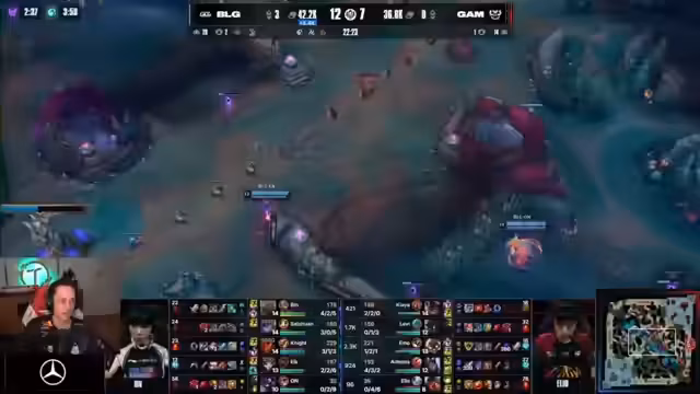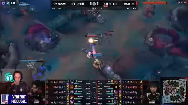 10:37:02Das letzte Spiel des Tages beginnt. Die Marines versuchen, ein aggressives Early-Game zu etablieren, indem sie BLGs Bot-Lane angreifen. Ein brutaler Dive führt zu einem Double-Kill für BLG, bei dem Artemis und Elio auf Level 1 null CS haben. Die Marines werden mit einer 0-8 Bilage nach zwölf Minuten konfrontiert. Der Streamer betont, wie mechanisch sauber BLG in diesem Early-Game spielte und den kompletten Map-Controll übernahm.