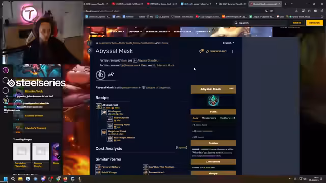 08:05:29Der Streamer analysiert seine Items und Spielweise. Er stellt fest, dass er trotz einer guten Statistik von 2/2/10 mehr Gold für Tankiness benötigt und überlegt, ob Spur-Visage der richtige Gegenstand gegen den hohen Magic Damage der Gegner ist. Die Fokus liegt auf der optimalen Item-Wahl für seine Rolle, wobei der gegenwärtige Build nicht als optimal erscheint. Die Entscheidung über Gegenstände wie Spur-Visage oder Maw of Malmortius ist im Diskurs, wobei er feststellt, dass sein Job primär das initiieren von Teamkämpfen ist, auch wenn er im letzten Kampf nicht den Pentakill machen konnte. Er argumentiert, dass eine zusätzliche Tankiness für seine Rolle vorteilhaft wäre, besonders wenn sein Team bereits stark ist.