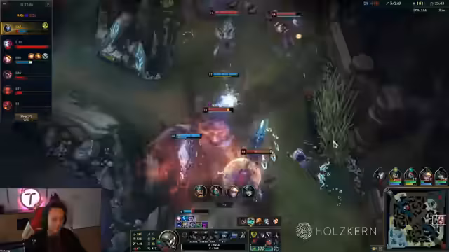 09:16:38Nach einer misslungenen Drachenjagd im unteren Jungle, bei der er fast den gesamten Team-Fight verliert und sein Smite verschwendet, analysiert der Streamer seine Fehler. Er erkennt an, dass er entweder hätte smiten oder den Fight gar nicht erst eingehen sollen. Später im Spiel diskutiert er über sein Item-Build und erwägt, statt eines aggressiven Builds defensiver zu itemisieren, um den hohen Schaden der gegnerischen Orianna und Karma überleben zu können.