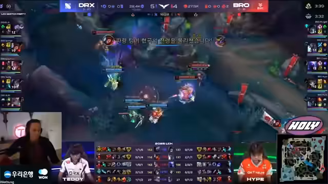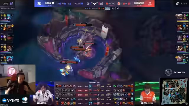 02:57:47Das Spiel erreicht seinen Höhepunkt in einem finalen Teamfight um das Nexus. DRX setzt Teddy mit Kaisa als primäres Ziel an. Nach einem heftigen Kampf und mehreren Tötungen auf beiden Seiten ist das Nexus fast zerstört. Polo rettet das Team, indem er einen Recall abbricht und sich opfert, um dem Gegner den Zugriff auf den Nexus zu verwehren. Die Bros gewinnen das Game durch die Zerstörung des Nexus und feiern den lang ersehnten Sieg.