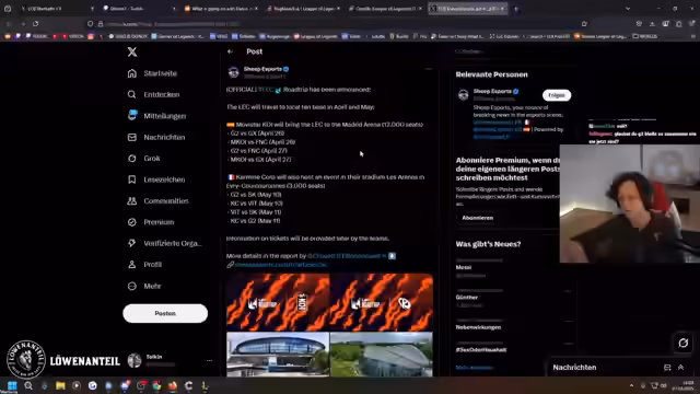 03:50:49Während des Streams wird über kürzliche Ankündigungen zur League of Legends European Championship (LEC) gesprochen. Riot Games plant zukünftig Events an verschiedenen Orten in Europa zu veranstalten, darunter Madrid und Paris, anstatt wie bisher hauptsächlich in Deutschland. Die Beweggründe sind größere Arenen und bessere Erreichbarkeit für europäische Fans.