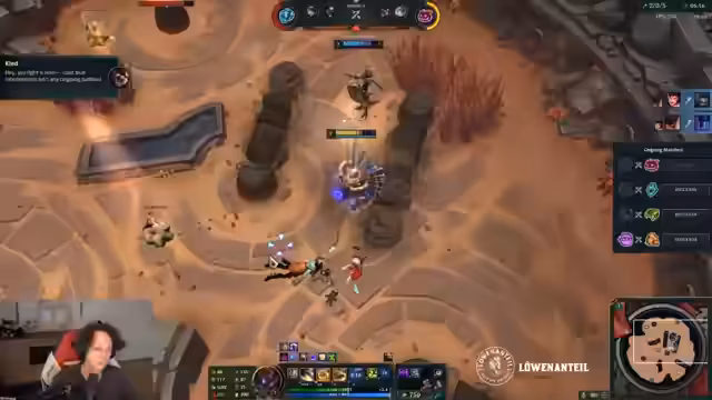 04:47:38Es finden sich live kommentierte Kämpfe statt. Der Streamer analysiert die Performance des gegnerischen Janna mit dem Angel of Retribution Augment. Er diskutiert über seine eigene Taktik mit Gargoyles und Heartsteal. Die Situation zeigt die Wichtigkeit von Timing und Item-Aktivierung in teambasierten Kämpfen.