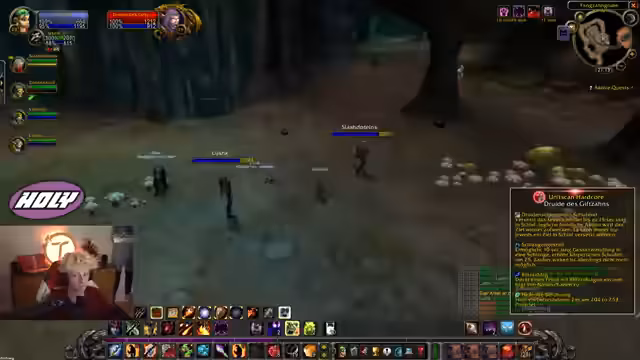 01:34:30Eine Gruppe von Spielern besiegt gemeinsam Elite-Oger der Mogrosch in Loch Modan. Der Streamer nutzt seinen Hexenmeister mit Schattenblitzen und Flüchen, während die Gruppe taktisch vorgeht, um Aggro zu managen. Es werden Verstrecker, Schläger und Ogereinheiten eliminiert, wobei der Gesundheitsstein und Heilungsfähigkeiten kritisch sind. Nach erfolgreichem Abschluss der Quest werden Belohnungen eingesammelt und das Gebiet weiter erkundet, um weitere Questziele zu verfolgen.
