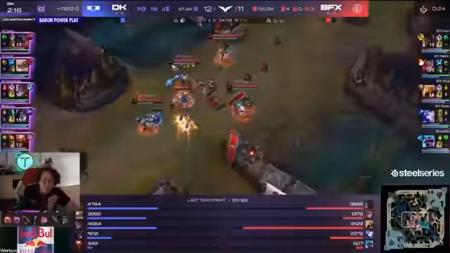 03:31:52Showmaker zeigt einen beeindruckenden Stunt, der fast zu einem Reset führt. Aiming überlebt mit wenig HP, aber Showmaker sichert sich einen Reset. Scanner erzielt einen Double Kill, und Diable sichert sich einen wichtigen Kill gegen Siebo. Kalista steht 4-0, was entscheidend ist. Dex gegen Cho'Gath wird als irrelevant abgetan. Der Kalista-Förstück erweist sich als wertvoll, und der Teamfight ist unglaublich knapp. Showmaker kann seine WE-Q aus maximaler Reichweite einsetzen. Kalini und Elming tragen ebenfalls zum Spiel bei. Aiming stirbt am Ende, aber Showmakers Stun auf Skanault ist entscheidend für den Reset von Victor. Diable spielt um Taliyahs E und sichert sich einen Triple Kill, was die Hoffnung für BFX wieder aufleben lässt.