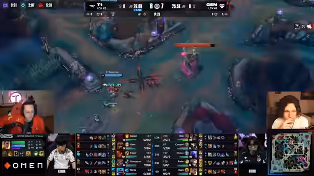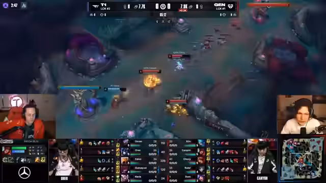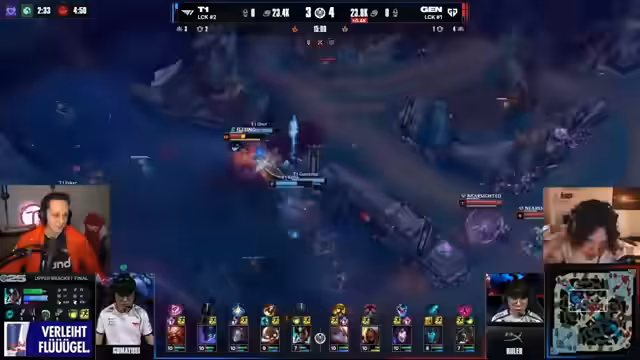 08:09:10Ein geniales Game klimaktisiert in einem epischen Teamfight. T1 kann den Nashor zwar verzögern, aber Gen.G. bleibt im Vorteil und hat die Seele. Der Streamer hebt das anhaltende, intensive Teamfighting und das Entscheidungssvermögen beider Teams hervor. Jeder Fehler scheint das augenblicklich zu entscheiden. T1s Draft scheint zu kurz gegriffen, aber sie kämpfen sich zurück. Die Seele ist der entscheidende Faktor, aber T1 hat weiterhin Hoffnung. T1 muss aufhören, blind in die Fighte zu gehen, da Gen.G. den entscheidenden Lockdown über alle Ecken und Winkel hat. Guma Yuzi bekommt seine Klinge der Unendlichkeit, was seinen Damage-Spike markiert.