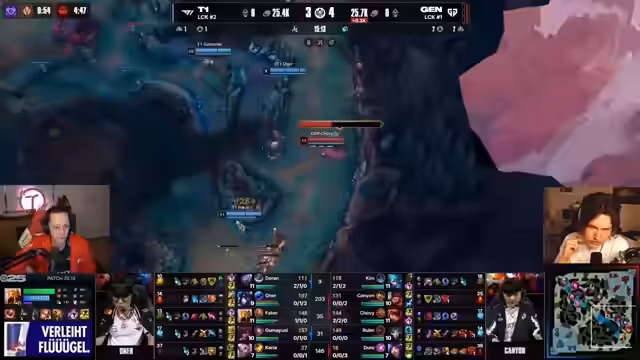08:14:02T1 hat den letzten Teamfight trotz des massiven Vorteils von Gen.G. gewonnen. Der Streamer bezeichnet das Matchup als krank und schreibt Geschichte. T1 rettet dieses Game mit Scrapes. Der Fokus liegt auf dem unglaublichen Teamfighting und den Playmakern. Faker hat mit 15.000 Damage im Fight beeindruckt. Allerdings bleibt die Ocean-Soul bei Gen.G. Doran hat eine fette Wampe in Gen.G.s Gesicht geschleudert. T1s Draft hat ihnen geholfen, das Spiel nach Hause zu holen, und das trotz eines vermeintlichen Nachteils. Das Matchup zwischen den beiden Top-Teams liefert das, was alle Fans wollten.
