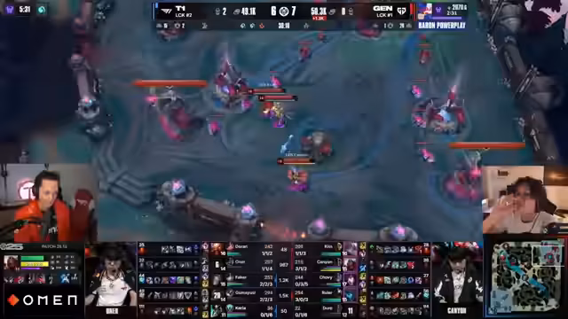 05:52:03Die Partie erlebt weitere dramatische Wendungen. Nach einem Teamfight kann Chovy knapp überleben und verhindert den totalen Kollaps von Gen.G. Gen.G. kontert mit einem Collapse, der T1 zurückwirft. T1 kann jedoch durch eine extrem starke Ultimate von Oner auf Rumble und anschließende Kills den Vorteil zurückerobern und Gen.G. massiv zurückwerfen. Sie holen sich den zweiten Drake zurück und erhöhen ihren Goldvorsprung. Das Spiel ist wieder offen und hängt nun von der Entwicklung im späteren Spielverlauf ab.