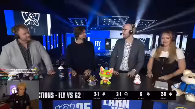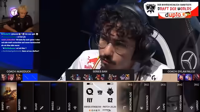 03:50:11Für das zweite Spiel wird eine offensive Draft für G2 diskutiert. Man hofft, mit Champions wie Orianna oder Azir auf der Blue-Site mehr Playmaking zu ermöglichen. FlyQuest blockt jedoch überraschenderweise diese Champions, was G2s Pläne durchkreuzt. Man entscheid sich stattdessen für eine Antwort mit Trundle und Galio, um den von FlyQuest gepickten Sinasau und Annie zu kontern. Der Fokus liegt nun darauf, im Early-Game stärker zu sein und Power Spikes früher zu erreichen.