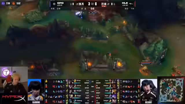 01:15:18Nach der ersten Partie wird auf die strategischen Anpassungen eingegangen. Die Kommentatoren analysieren die Drafts beider Teams und argumentieren, dass HLE objektiv bessere Champions für Teamfights hat. Trotzdem wird der starke individuelle Carry von Doggo bei CFO erwähnt, der eine realistische Chance im Game bot. Die Kommentatoren gehen auch auf die potenziellen Schwächen in der koreanischen Draft ein, bleiben aber bei ihrer Einschätzung der überlegenen Teamfight-Fähigkeiten von HLE.