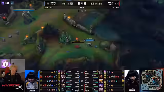 01:06:42PSG beginnt, seine frühe Führungsposition durch die Kontrolle über den Drachen auszubauen und zielt auf eine frühzeitige Seele ab, um eine entscheidende Power-Spike zu erlangen. Spieler wie Peanut von HLE agieren dabei extrem aggressiv und ignorieren taktische Risiken, um Kills zu sichern, was zu einer 5-0-Situation führt. Die Kommentatoren loben die durchdachten Entscheidungen der koreanischen Spieler, die den Kampf auf die Objectives lenken und so den Druck auf PSG aufrechterhalten.